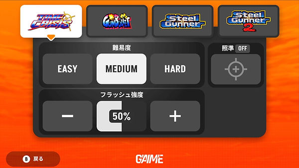 1. メインメニュー(以下画像)でコントローラーの右側前面「Bボタン」を長押しすることで、設定画面へ入ることができます。そこで、各ゲームの難易度設定ができます。